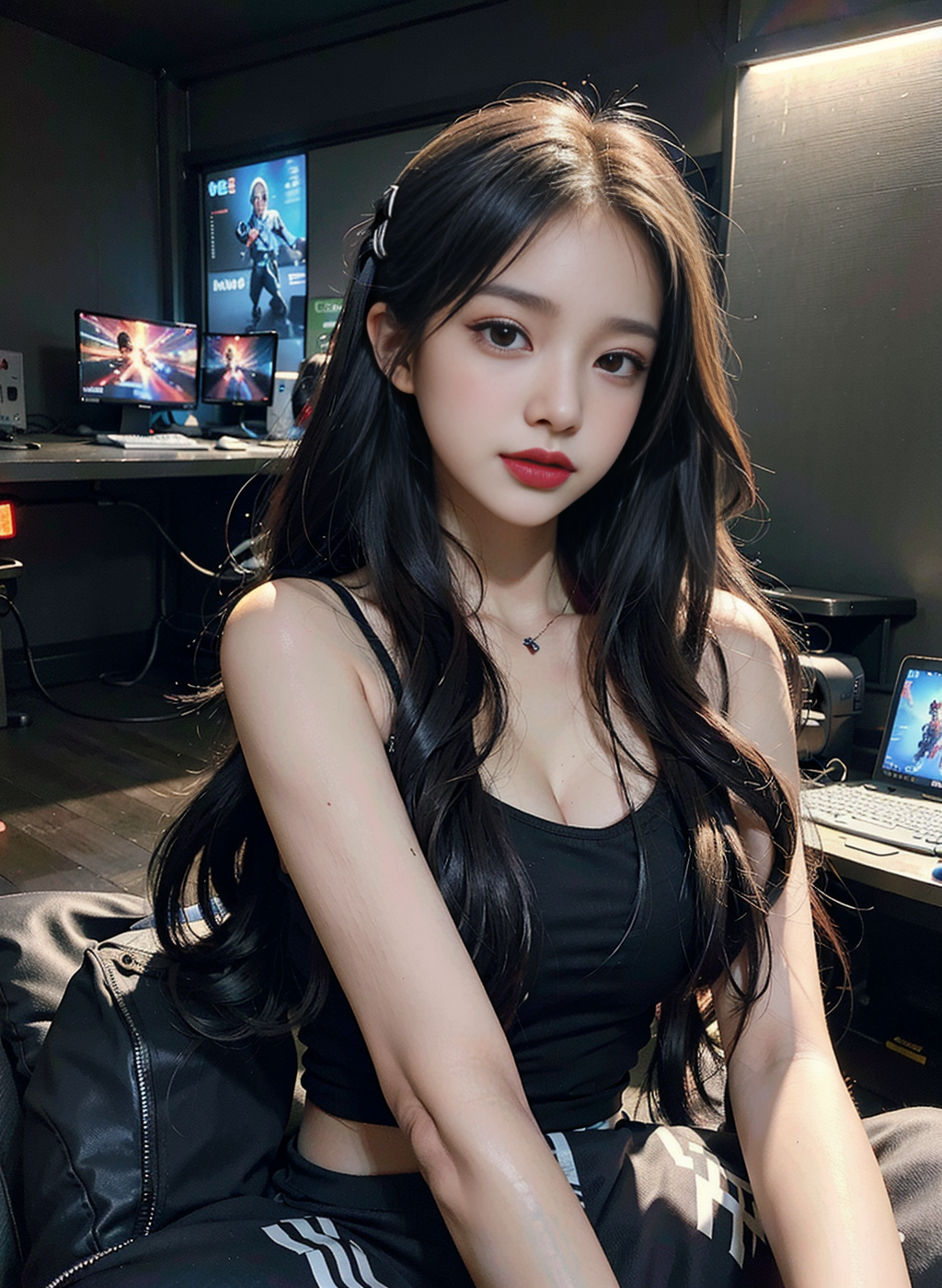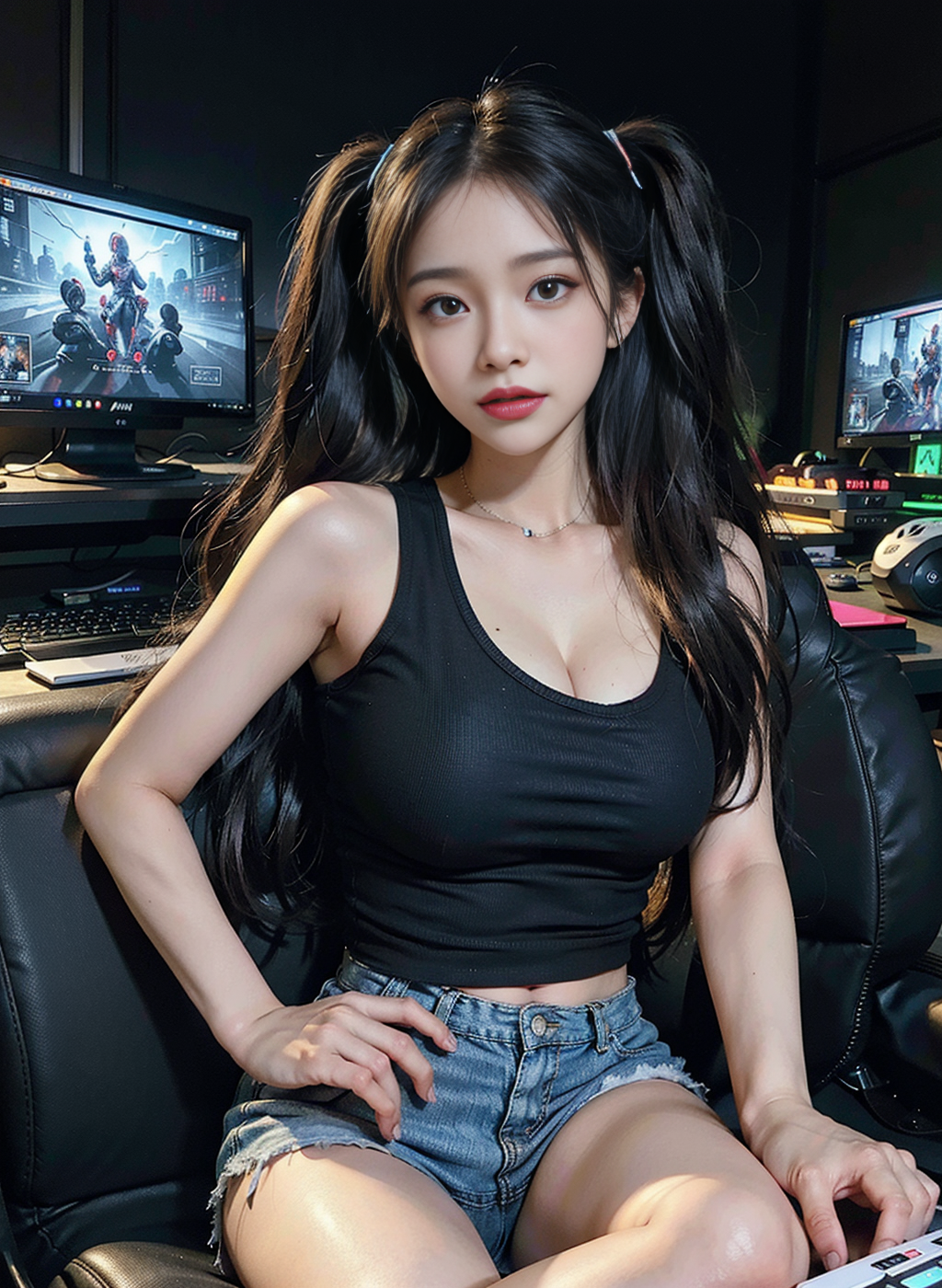 (best quality top quality, masterpiece), beautiful and aesthetic, official art, intricate details, ultra-detailed, cinematic shot, detailed shading, ((low key)), (cyberpunk theme:0.25), detailed background, ( petite, professional gamer), twintails, playing game, (angry:0.8), headset, (in dark room filled with gaming gears), multiple gaming monitors, workstation, gaming chair, gaming keyboard, gaming mouse, tuned PC, (RGB neon lights), fullbody, ,large breasts , cleavage,black wearing shorts ,((black tank top)),((play computer game)),((smile)),